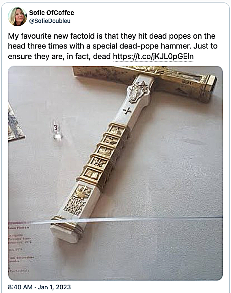 The Vatican today planted emeritus Pope Benedict XVI in three coffins because he was dead. We know he was beyond feeling pain because he didn’t cry “ouch” when he was hit on the head three times with a fancy ceremonial hammer.