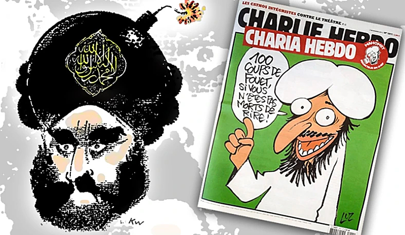 Jyllands-Posten’s Mohammed cartoon from 2005 and Charlie Hebdo’s 2011 cover. Image via the National Review.