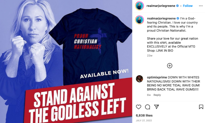 Today I learned that the God-and-guns lunatic has been flogging “Proud Christian Nationalist” T-shirts since last summer for $30.00.