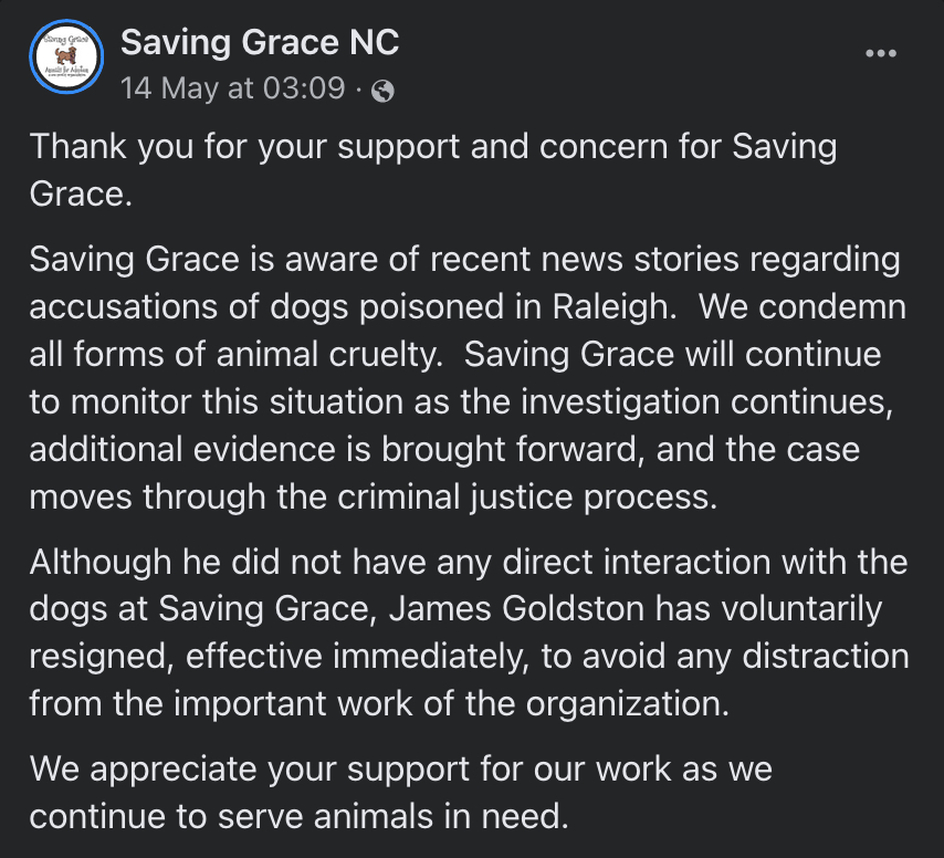 The arrest of the pair led to Goldston’s resignation from Saving Grace Animals for Adoption in Wake Forest, North Carolina. He also quit his position chairman of the board of trustees of a Baptist Children’s Home.