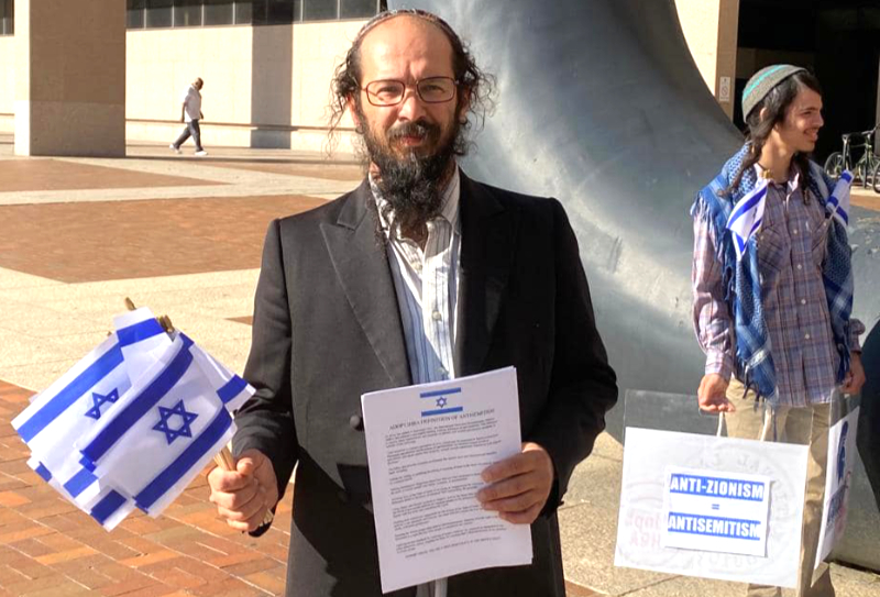 One major theme of his protests is that “Palestinians and Nazis are the same thing.”