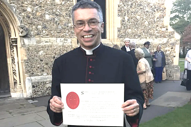 David Tudor pictured with a certificate signed by Cottrell making him an honorary canon of Chelmsford Cathedral in 2015. Image via Facebook.